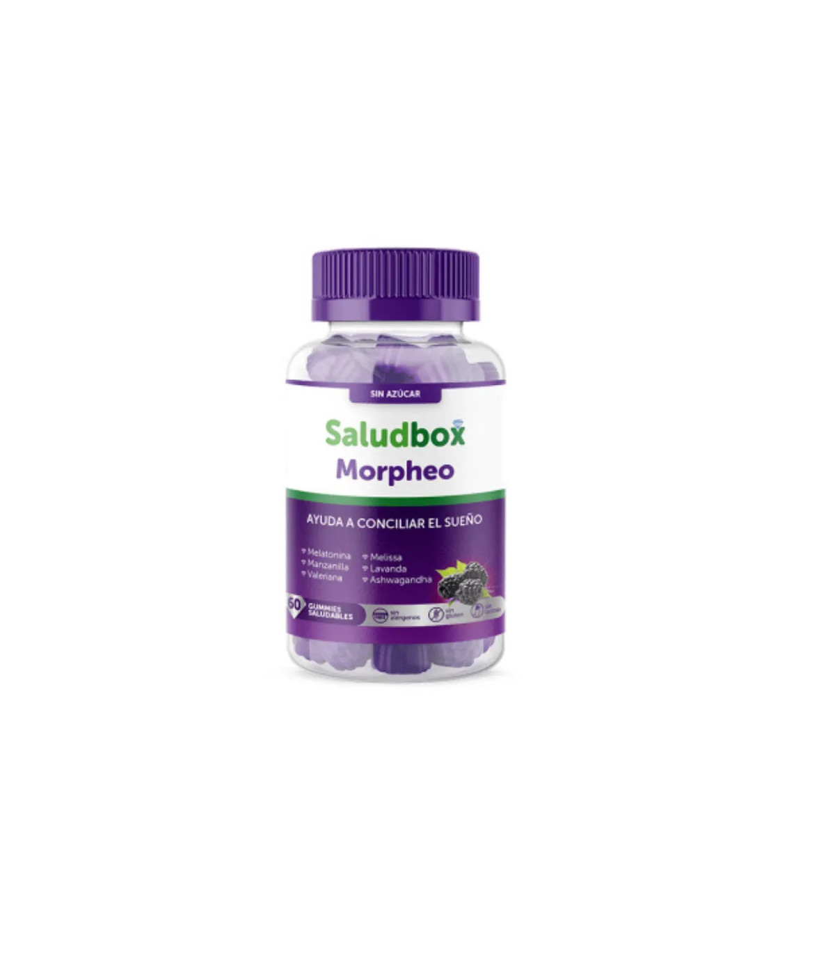 Saludbox Morpheo Gummies son gominolas vegetales sin azúcar con melatonina (1 mg) y extractos de manzanilla, valeriana, melissa, lavanda y ashwagandha. Ayudan a regular el sueño fisiológico y a despertar con buen ánimo. Tomar 1 gominola 30 minutos antes de dormir.