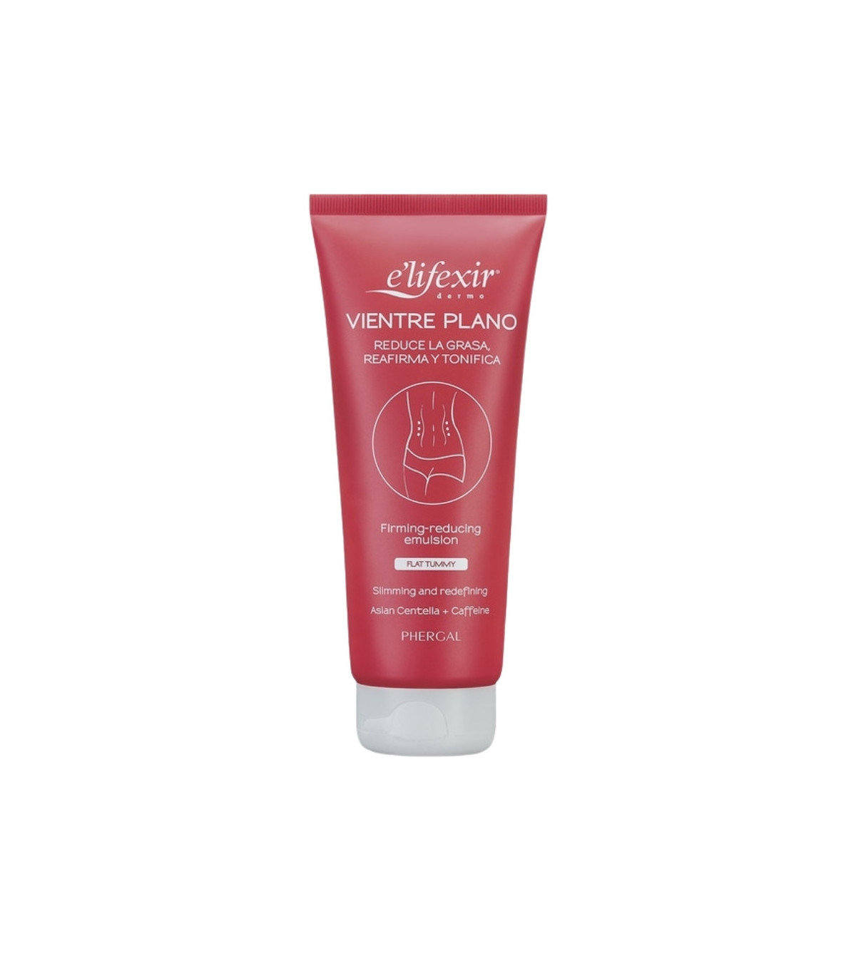 Elifexir Dermo Vientre Plano Activ 200 ml es un gel reductor de acción intensiva que ayuda a disminuir la grasa localizada en la zona abdominal, reafirmar la piel y mejorar el tono muscular. Su fórmula avanzada incluye una combinación de L-Carnitina, cafeína, centella asiática y creatina, activos que estimulan la quema de grasa, el drenaje de líquidos y la tonificación del tejido.