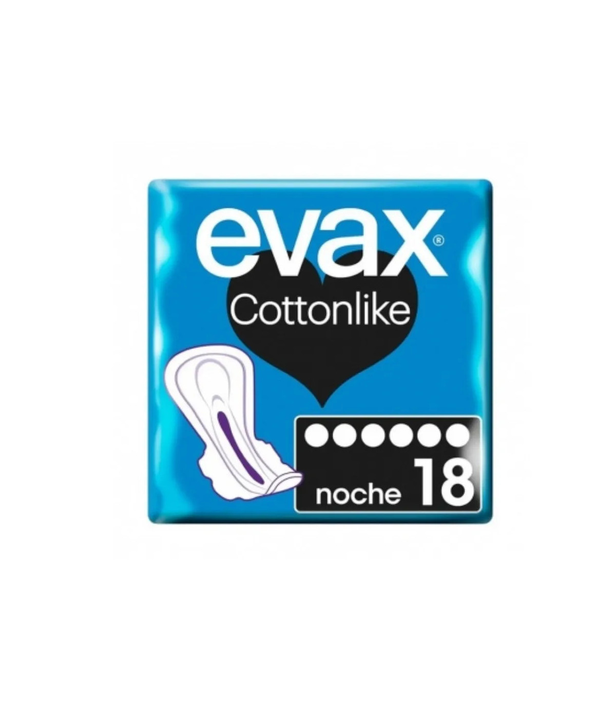 Evax Cottonlike Noche con alas ofrece protección extra durante la noche. Suaves, absorbentes y con control de olor. Pack de 18 compresas.