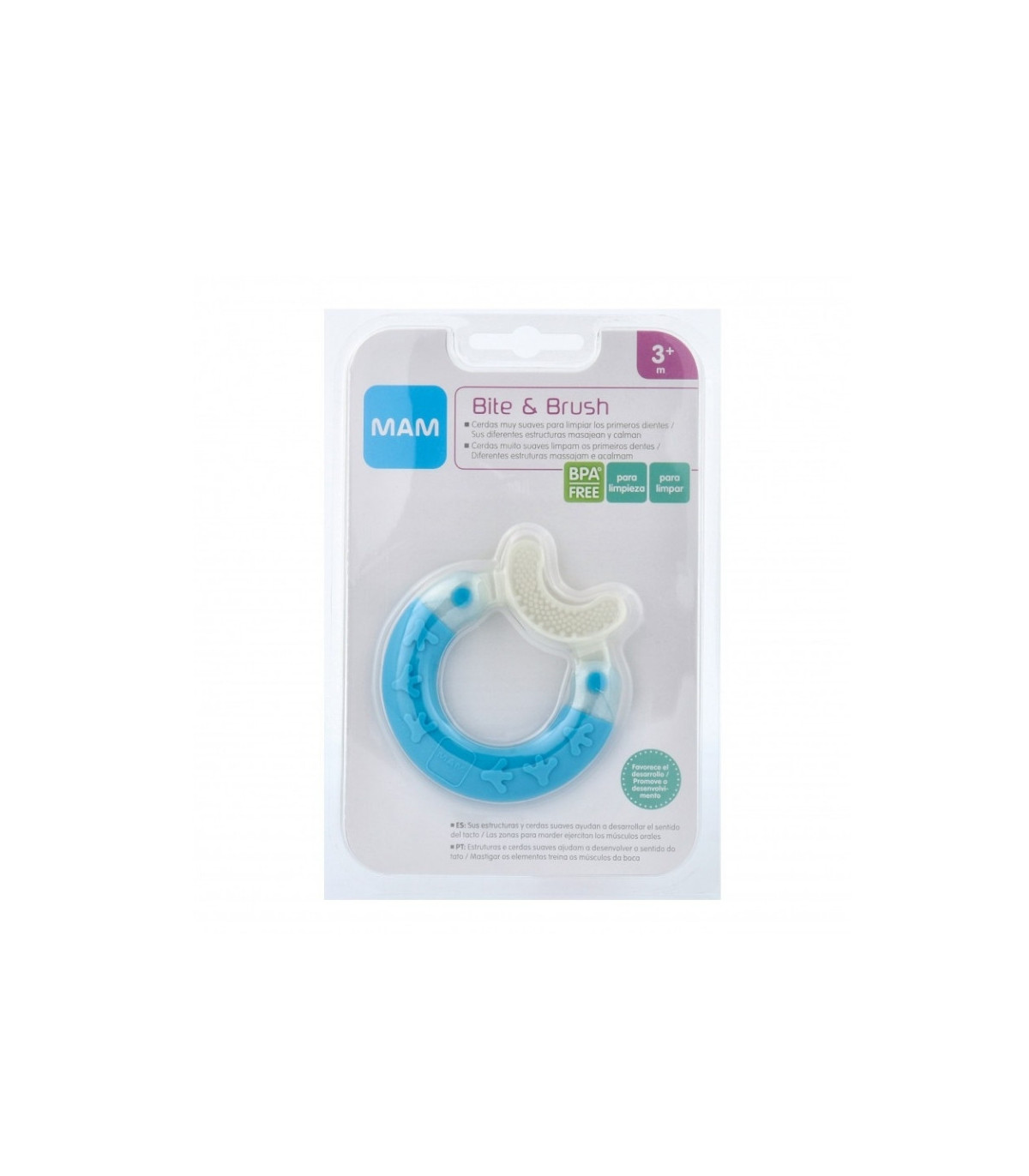 El MAM Mordedor Bite & Brush Azul está diseñado para aliviar las molestias de la dentición y al mismo tiempo contribuir al cuidado bucodental del bebé. Sus cerdas muy suaves masajean las encías inflamadas y ayudan a limpiar delicadamente los primeros dientes, favoreciendo una higiene temprana.