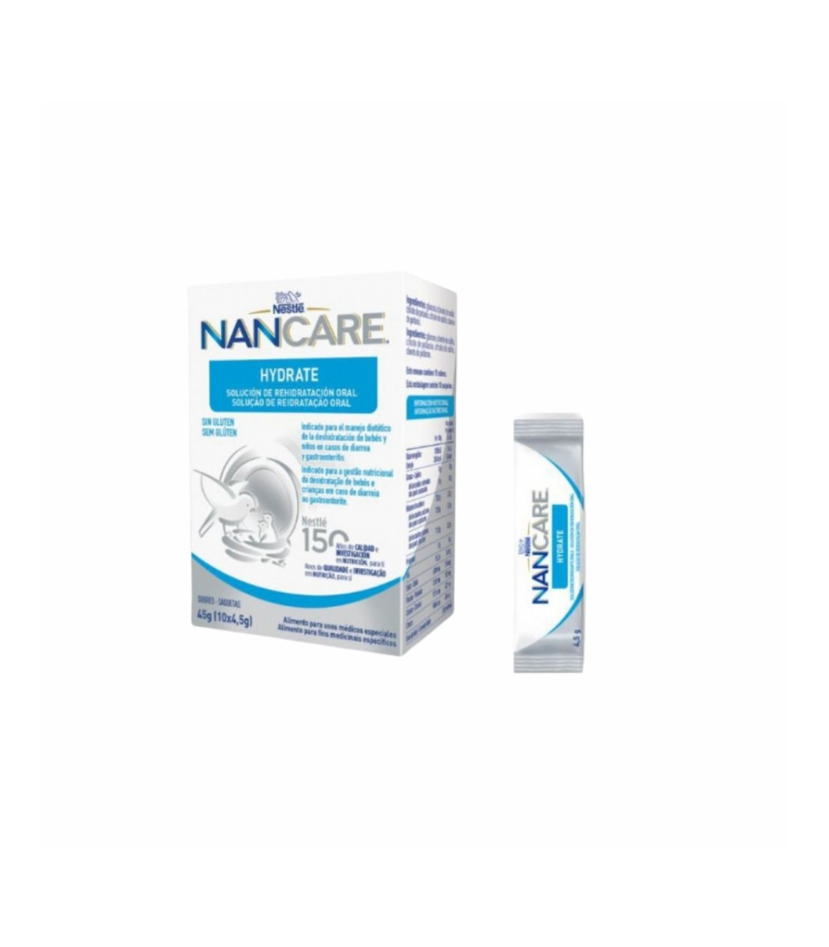 NAN CARE Hydrate 12 (10x4,5g) es un complemento alimenticio en polvo formulado para favorecer la hidratación oral en lactantes y niños pequeños. Su composición está diseñada para reponer líquidos, electrolitos y minerales esenciales en situaciones de pérdida hídrica como diarreas, vómitos o periodos de calor extremo.