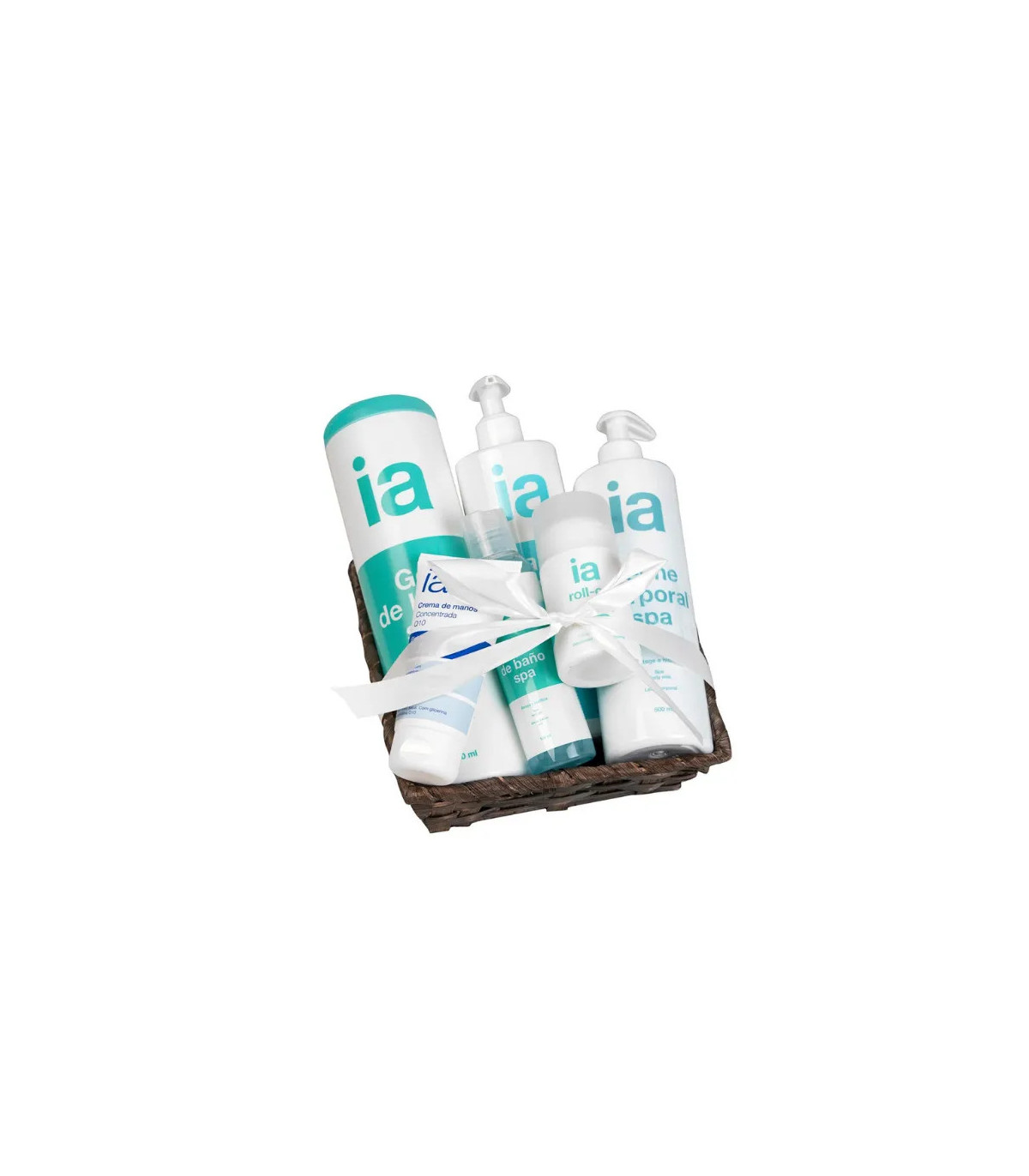 Estuche con seis básicos de cuidado corporal Spa (gel de baño 750 ml y 125 ml, leche hidratante 500 ml, champú diario 500 ml, crema de manos 50 ml y desodorante roll-on 75 ml) para una rutina completa de limpieza, nutrición y suavidad.