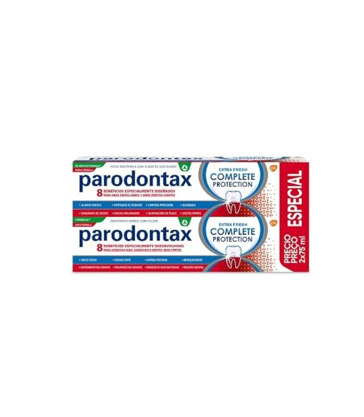 Pack ahorro con 2 pastas dentales Parodontax Complete Protection. 8 beneficios para encías sanas, dientes fuertes y aliento fresco. Uso diario.