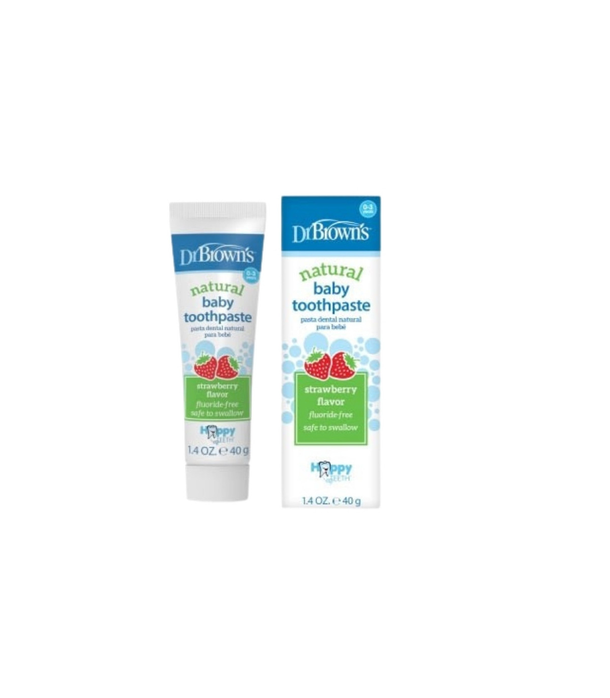 La pasta dental Dr. Brown’s Bebé 40 g limpia suavemente los primeros dientes, sin flúor ni ingredientes agresivos. Sabor natural, segura si se ingiere.