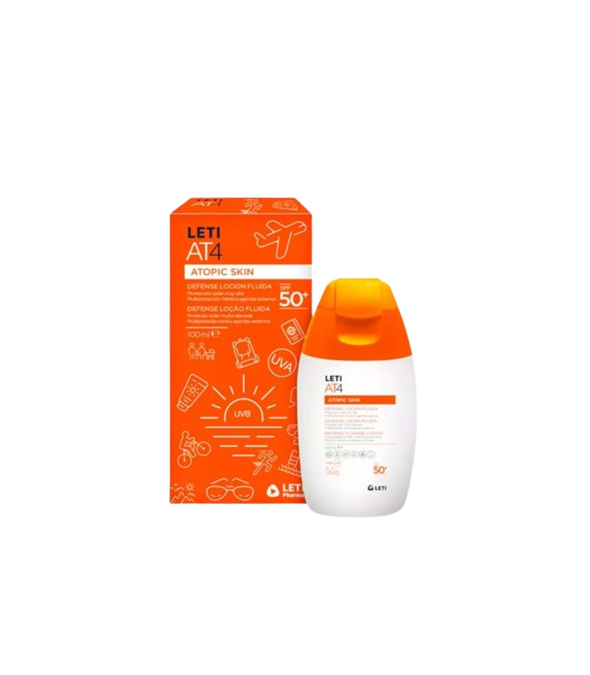 Leti AT4 Defense Loción SPF50 100 ml es un fotoprotector especialmente formulado para pieles atópicas, secas o sensibles. Su fórmula combina filtros solares de amplio espectro con activos hidratantes y calmantes que protegen frente a los efectos nocivos de la radiación UV y refuerzan la barrera cutánea.