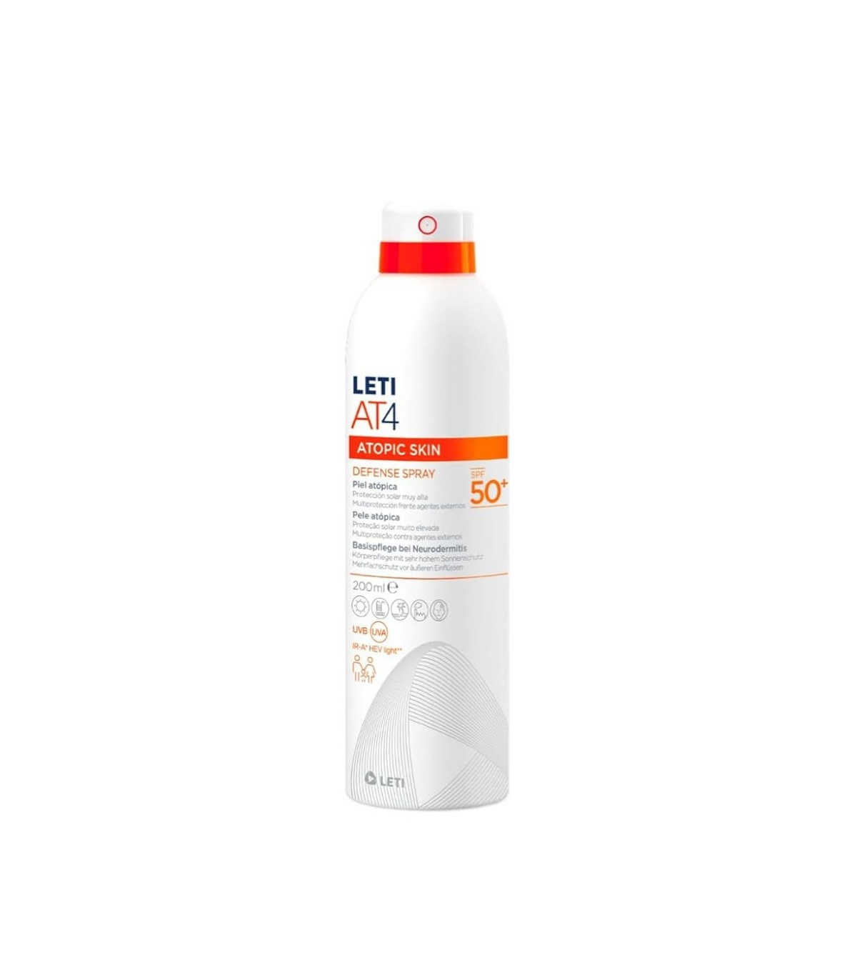 Leti AT4 Defense Spray 200 ml es un spray corporal de uso diario diseñado para el cuidado y la protección de la piel atópica, seca o sensible. Su fórmula avanzada ayuda a reforzar la barrera cutánea y a proteger la piel frente a agresiones externas como la polución, los cambios climáticos o la sequedad ambiental.