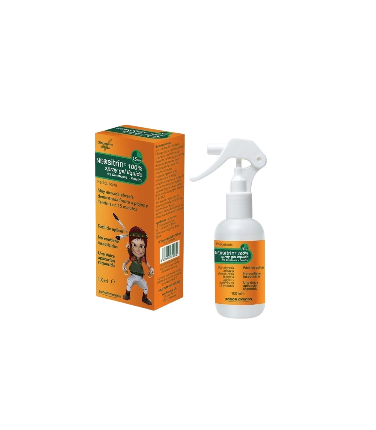 Neositrin 100% Spray Gel Líquido 100 ml es un tratamiento pediculicida de acción física, formulado para eliminar piojos y liendres en una sola aplicación de 1 minuto. No contiene insecticidas, lo que lo hace seguro y bien tolerado incluso por niños a partir de 1 año.