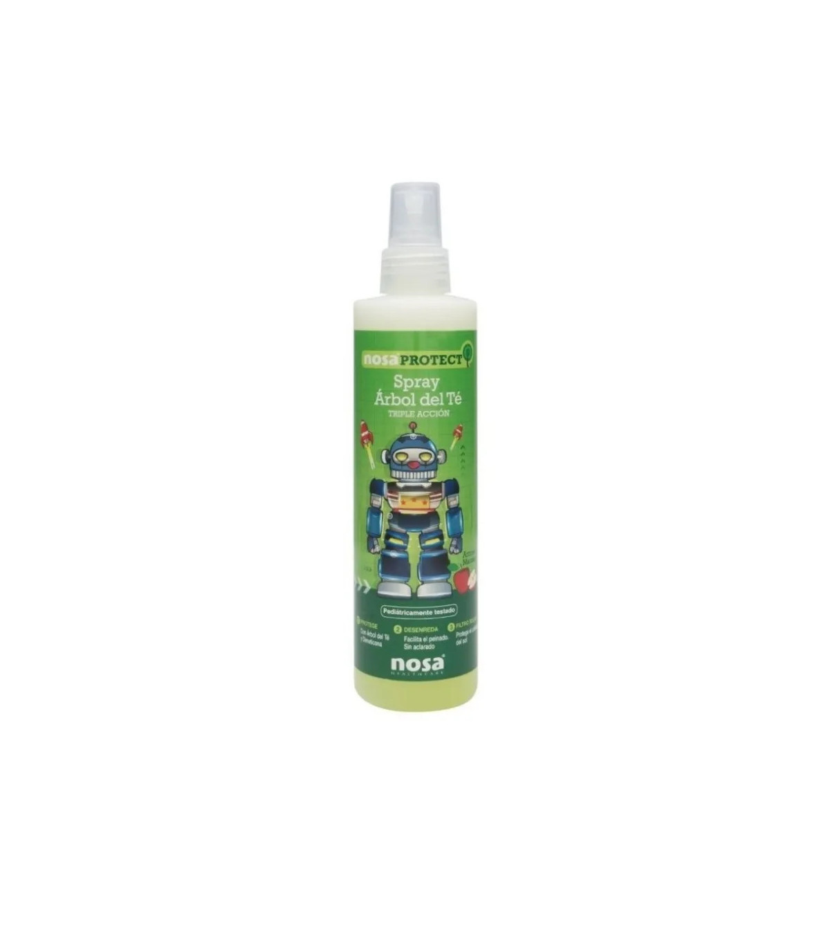 Spray desenredante Nosa Verde con árbol del té. Desenreda sin tirones, protege frente a piojos y deja el cabello suave, brillante y con aroma fresco.