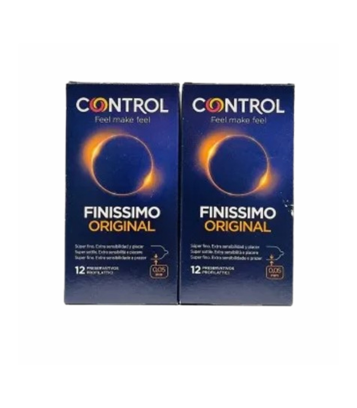 Pack valor de 12 preservativos ultradelgados Control Finissimo, con depósito de seguridad y lubricación extra suave para una sensación de máximo contacto piel con piel y protección fiable.