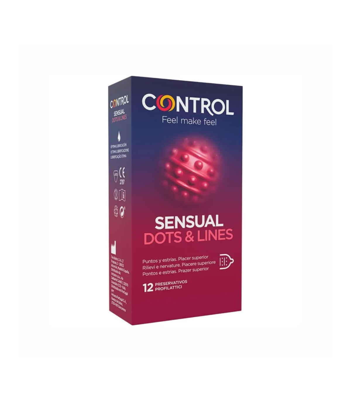 Control Intense Dots (12 unidades) son preservativos de látex natural diseñados para intensificar el placer gracias a su textura con puntos en relieve distribuidos estratégicamente por toda la superficie.