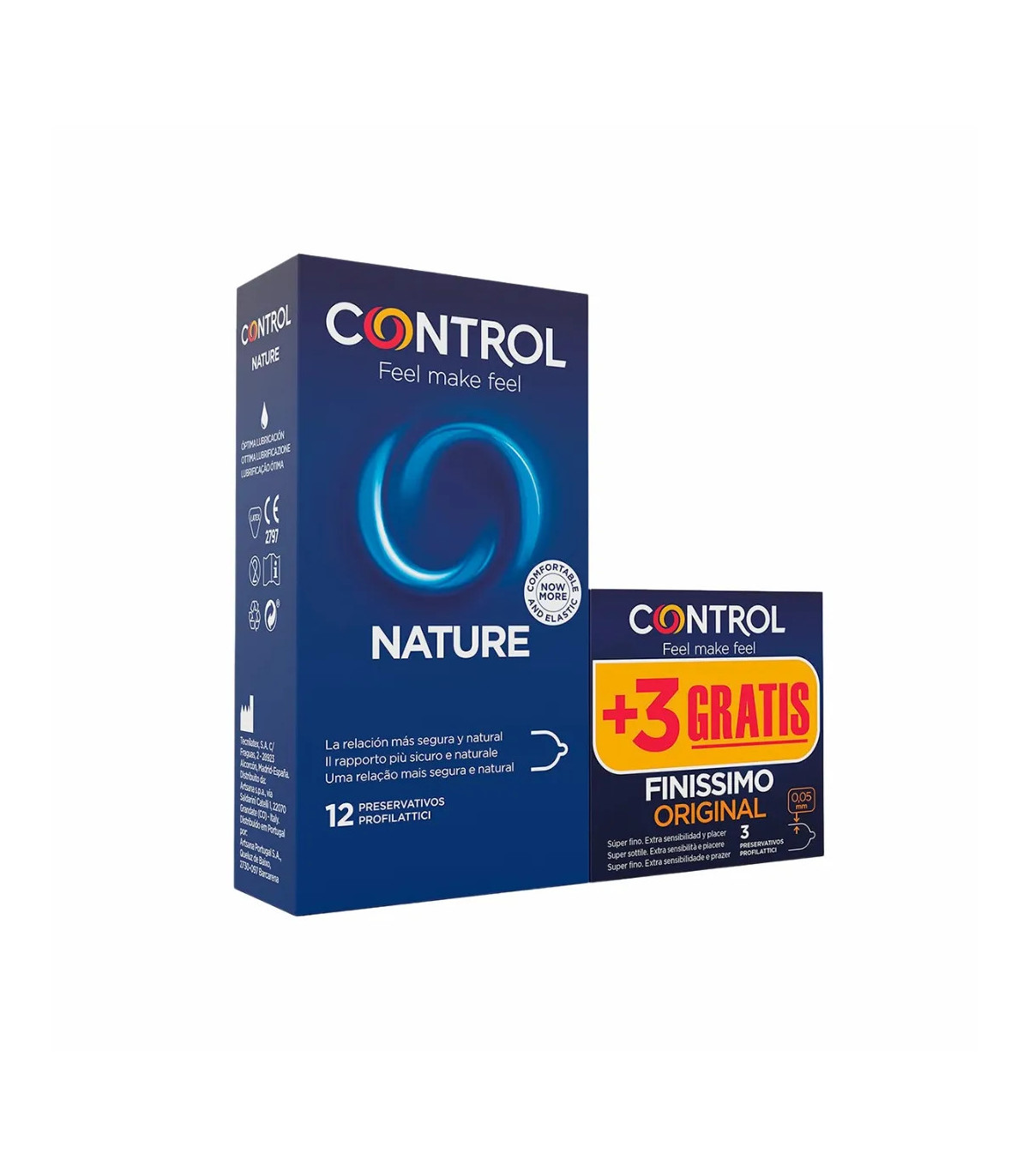 Control Nature 12 + 3 Finissimo es un pack combinado que incluye 12 preservativos Nature, conocidos por su ajuste anatómico y comodidad, junto con 3 unidades Finissimo, los más finos de la marca, diseñados para quienes buscan una experiencia más natural y sensible.