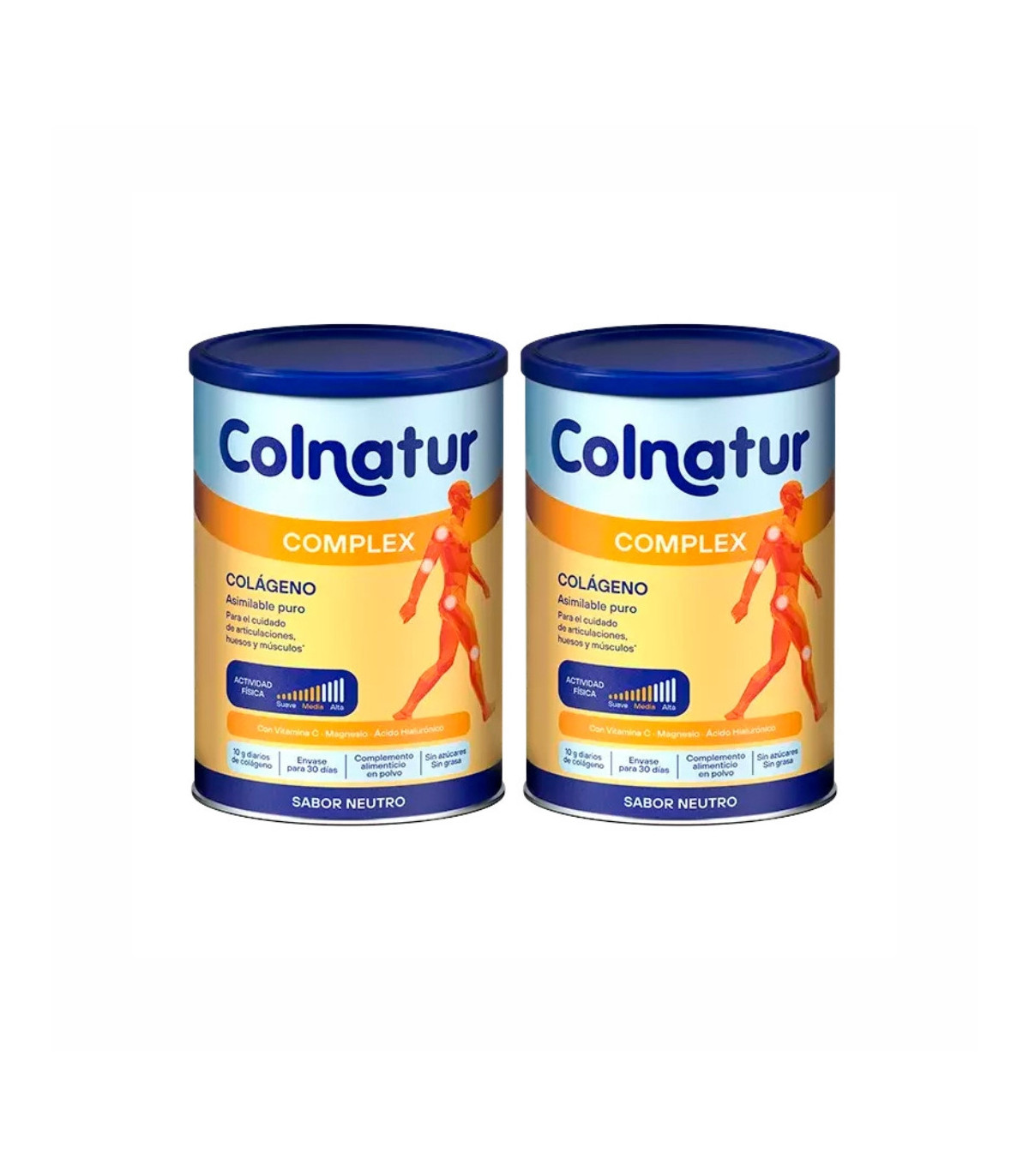 Colnatur Complex Neutro Duplo (2 × 330 g) es un suplemento alimenticio formulado para el cuidado del sistema musculoesquelético y de la piel. Contiene colágeno natural hidrolizado, enriquecido con magnesio, vitamina C y ácido hialurónico.