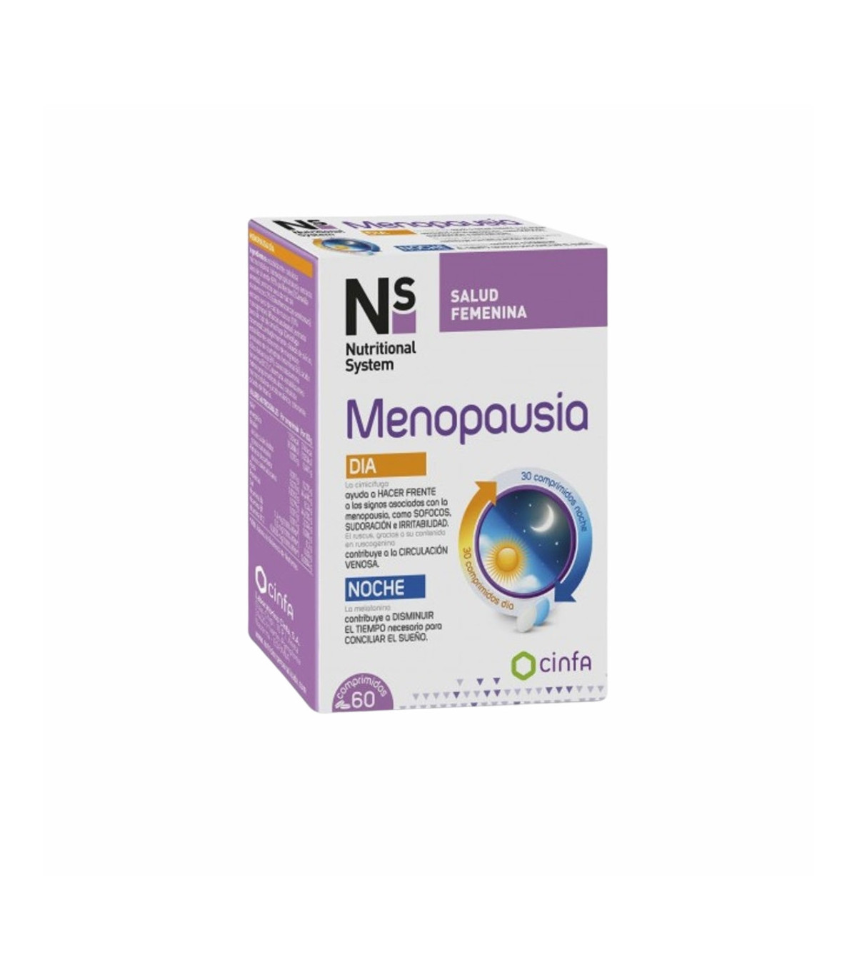 NS Menopausia Día y Noche es un complemento alimenticio diseñado para ofrecer un apoyo completo durante la menopausia. Contiene 60 comprimidos: 30 para el día y 30 para la noche, formulados con ingredientes naturales y vitaminas que actúan en los momentos clave del día.