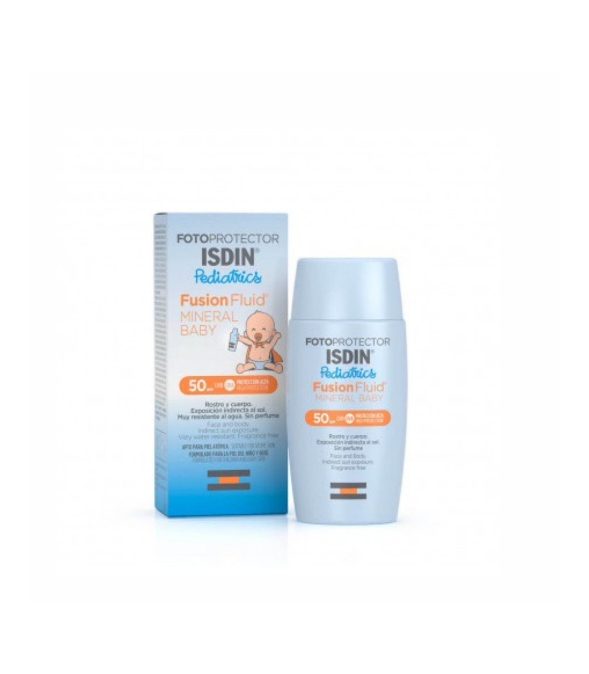 ISDIN Fotoprotector Baby Mineral Fusion Fluid SPF 50 es un protector solar facial especialmente formulado para la piel delicada y sensible de los bebés a partir de los 6 meses. Su fórmula con filtros 100 % minerales proporciona protección muy alta frente a rayos UVA y UVB, sin irritar ni agredir la barrera cutánea.
