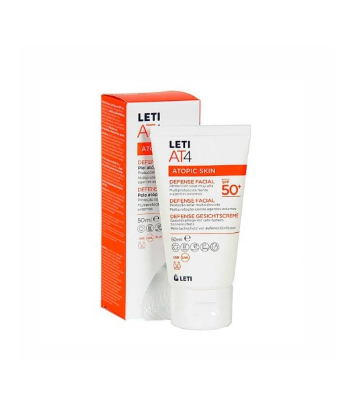 LETI AT‑4 Defense Facial SPF 50+ es una crema facial de alta protección solar (UVA, UVB) especialmente formulada para piel atópica, seca y sensible. Refuerza la barrera cutánea, hidratando y protegiendo frente a agentes externos como sol, cloro o contaminación.