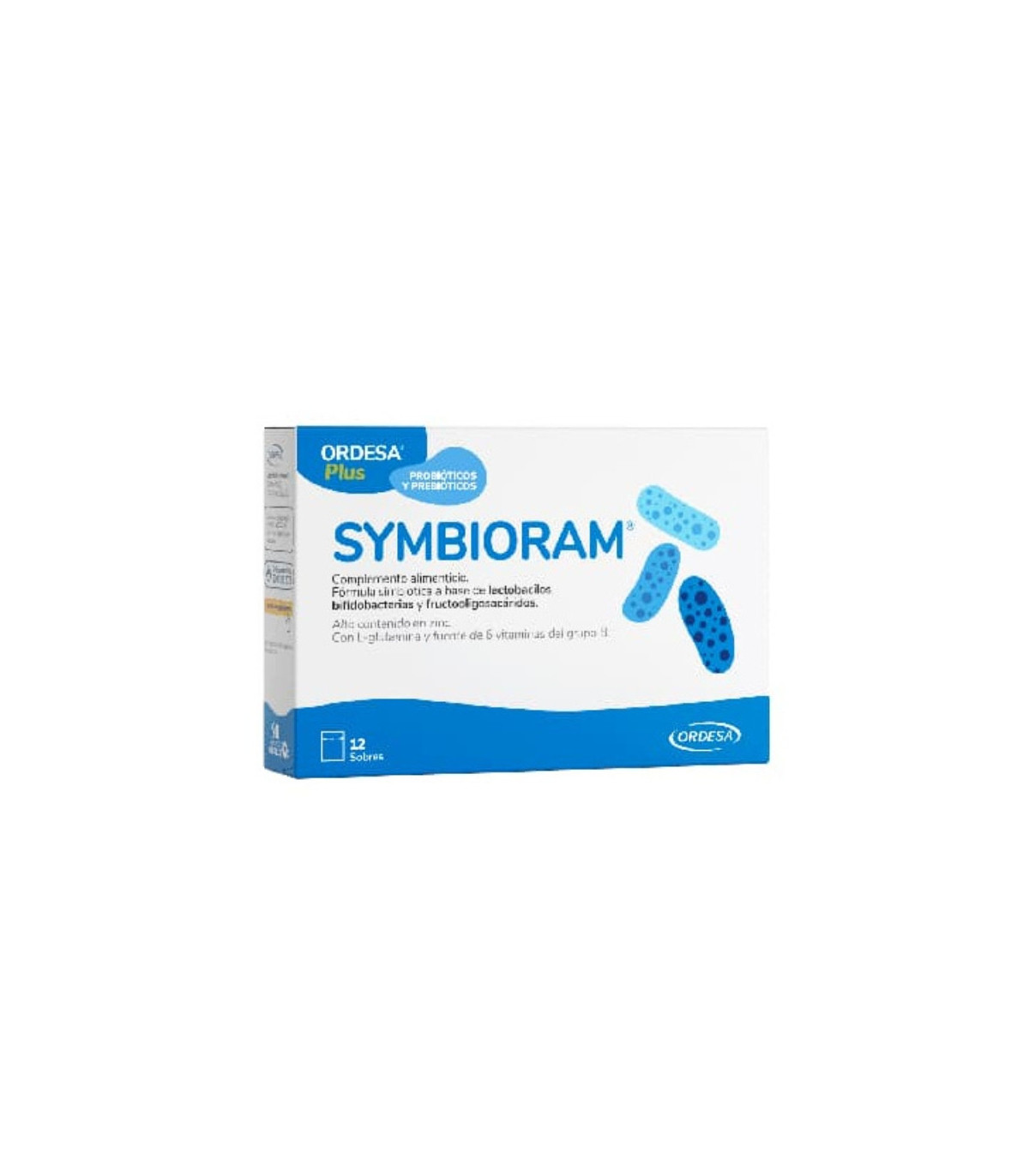 Symbioram 12 sobres es un complemento alimenticio que combina probióticos, prebióticos, vitaminas y minerales para ayudar a restaurar y mantener el equilibrio de la flora intestinal, mejorar la salud digestiva y reforzar el sistema inmunitario.