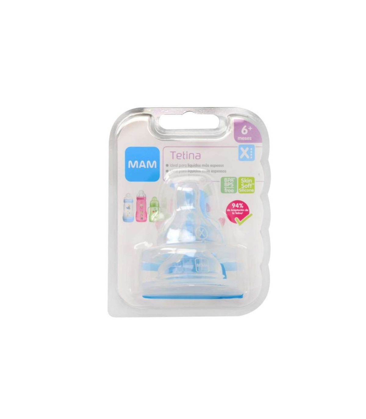 Pack de 2 tetinas MAM de silicona +6m, flujo 4 gotas. Diseñadas para papillas y líquidos espesos, compatibles con biberones MAM.