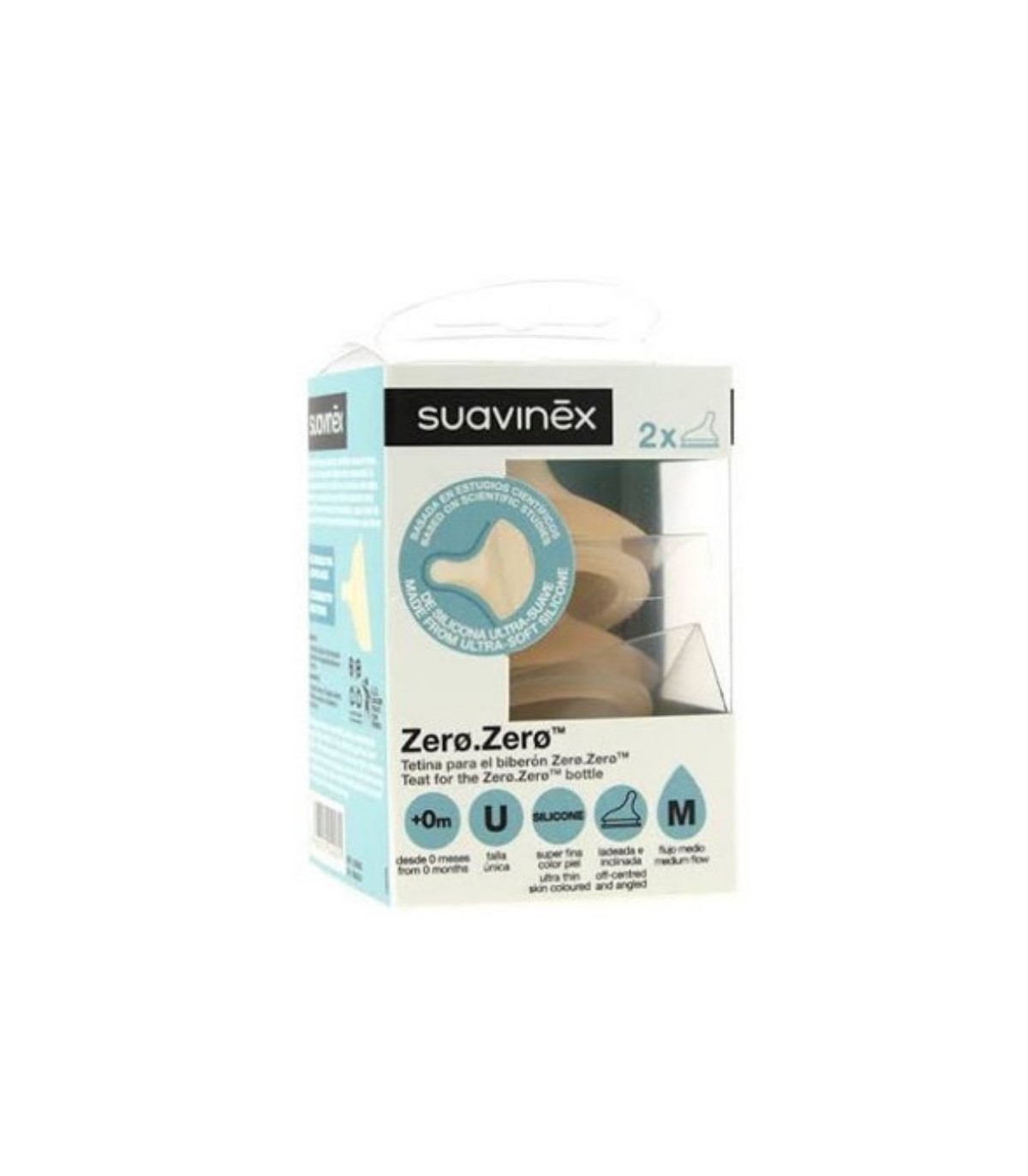 Pack de 2 tetinas Silicona Suavinex Zero, diseñadas para lactancia mixta con flujo adaptable y sistema anticólicos. Imitan el pezón materno, recomendadas desde el nacimiento.