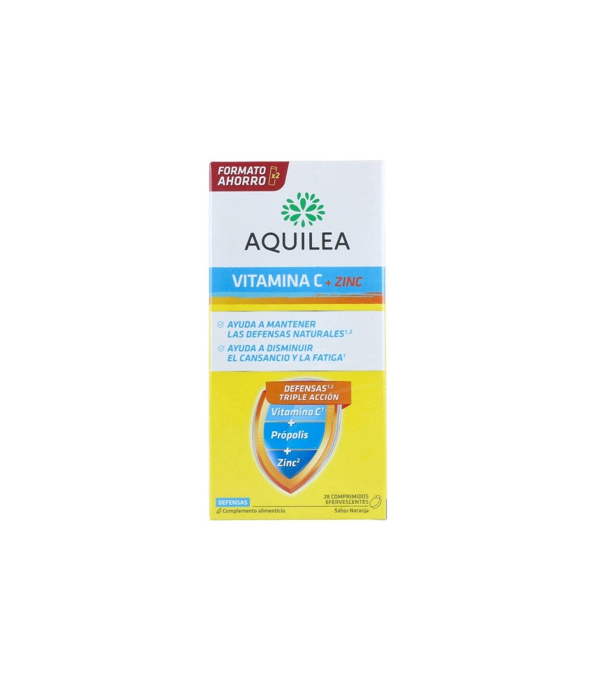 Aquilea Vitamina C + Zinc 28 Comprimidos Efervescentes es un complemento alimenticio que refuerza el sistema inmunitario y ayuda a proteger las células frente al daño oxidativo. Su combinación de vitamina C y zinc contribuye al funcionamiento normal del sistema inmunológico y ayuda a reducir el cansancio y la fatiga, especialmente en épocas de mayor desgaste físico o cambios de estación.