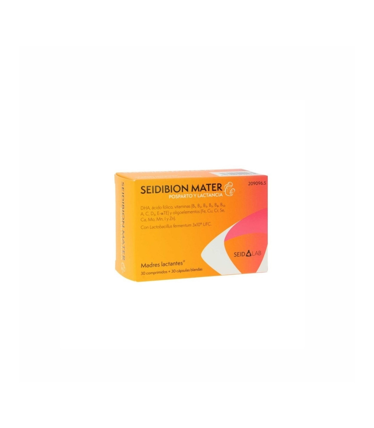 Seidibion Mater es un complemento alimenticio que combina cápsulas con DHA y comprimidos con vitaminas, minerales y probióticos, cubriendo las necesidades nutricionales en embarazo y lactancia.